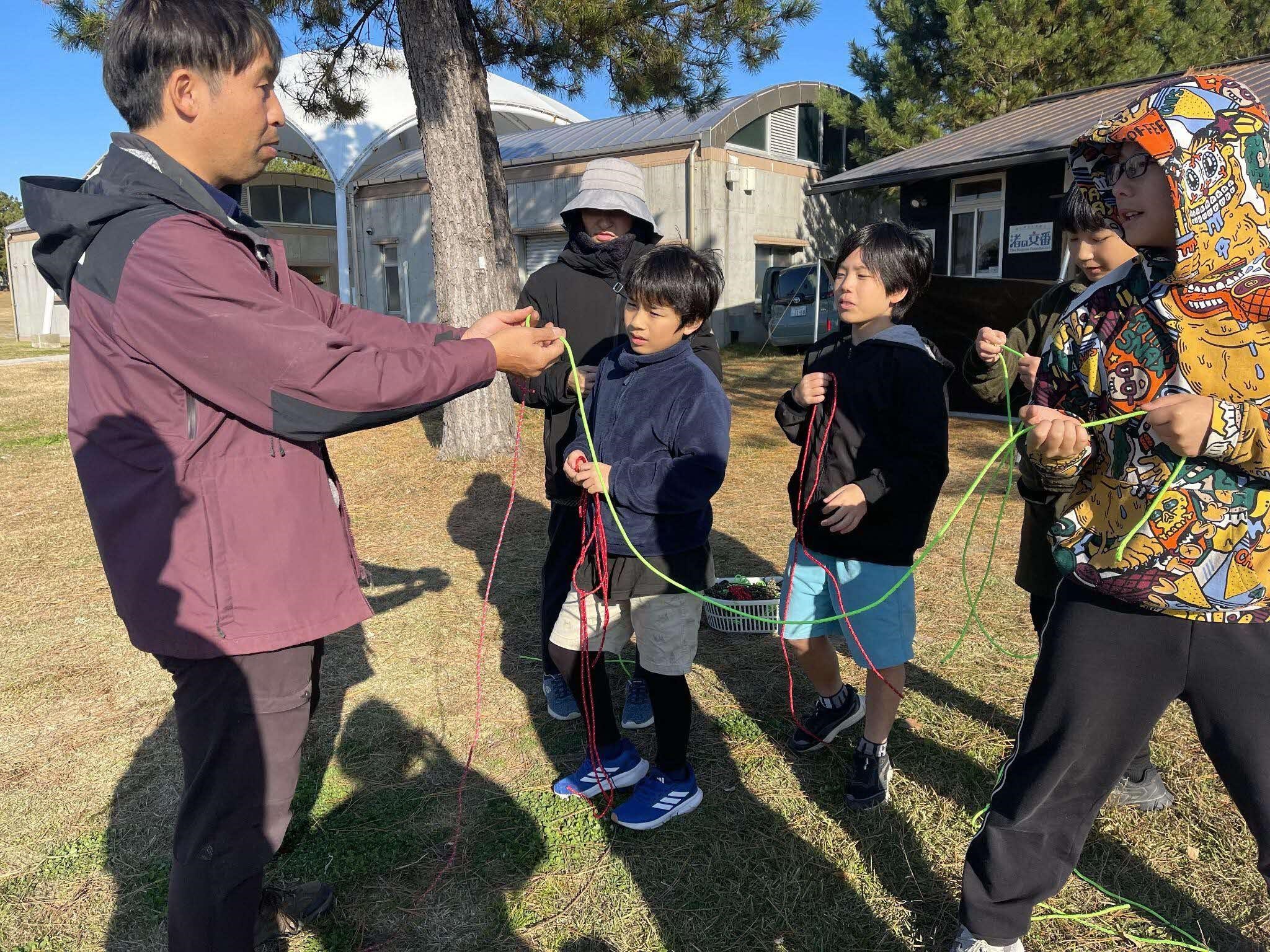 シェルター作りにチャレンジしたのは、小学校高学年の男の子たち。硬く結べるのに、簡単に解ける結び方の習得に、熱心に耳を傾けます。