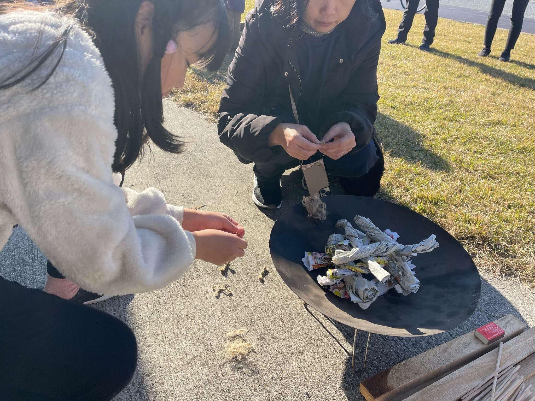午後は、前日に訪れた山口きらら博記念公園に戻って、火おこしやシェルター作りのデイキャンププログラムを体験!スイッチひとつで調理ができる現代の生活とは違い、自分たちで薪を組み、火を育てる。